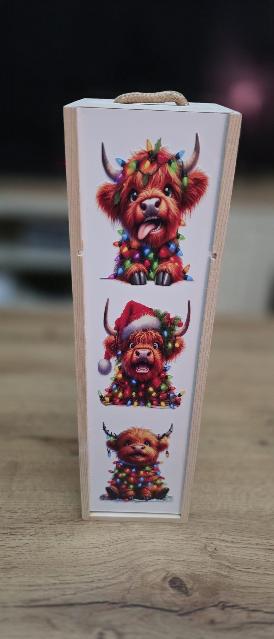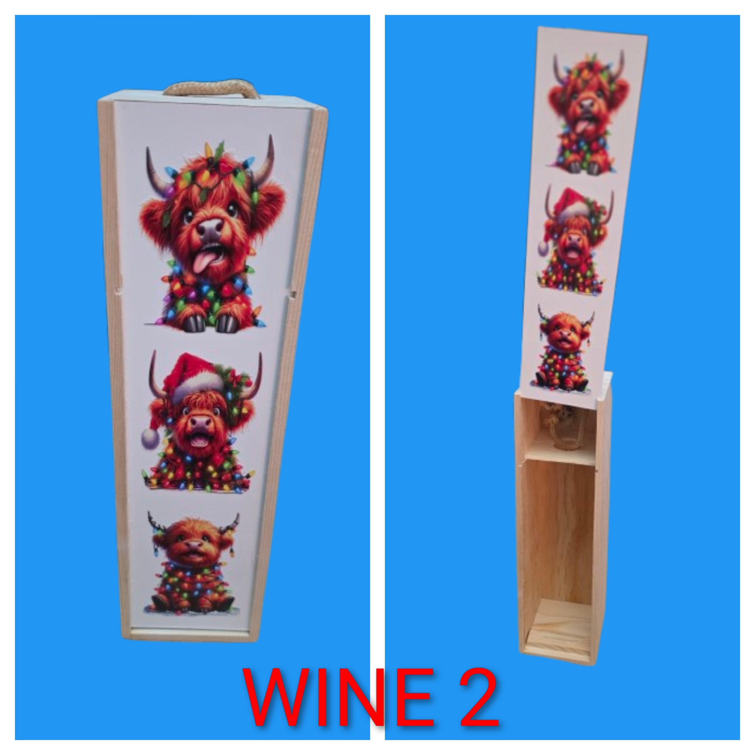 These stunning wooden wine boxes are the perfect addition to the gift of wine, made from sturdy light coloured wood and come with a handy rope carry handle and a neck brace inside to prevent the bottle from rocking about inside, the front cover slides up and reveals the bottle inside. Perfect to customise with your images and text or choose one of our pre made designs.